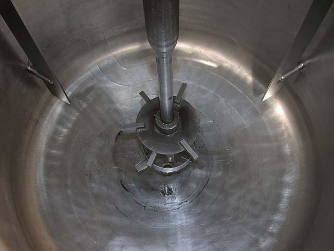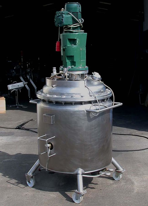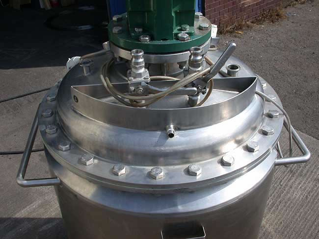 STAINLESS STEEL SERVICES process vessel in 316L stainless steel. Built to ASME VIII V1 in Dec. 1991. 800mm i/dia x 930mm deep incl 160mm deep dish, gross capacity 320 litres to top cover flange. Vessel is rated for 1 bar + full vac design pressure. External stainless steel limpet coil jacket to side and dish rated at 6 bar design, 9 bar test and is insulated and stainless clad. 90C d.t. vessel and jacket. 40mm dia bottom outlet with valve. Two stage mixer fitted, LIGHTNIN type HS155 with an A310 impellor and a six blade radial disc, driven from a 1.5kw 940 rpm Flp motor via a speed reduction gearbox. Top dish connections include a 150mm dia chargeport, vessel light plus 20mm and 32mm ports. Bottom dish has a temperature probe. Vessel has 4 x s/s legs with castors.