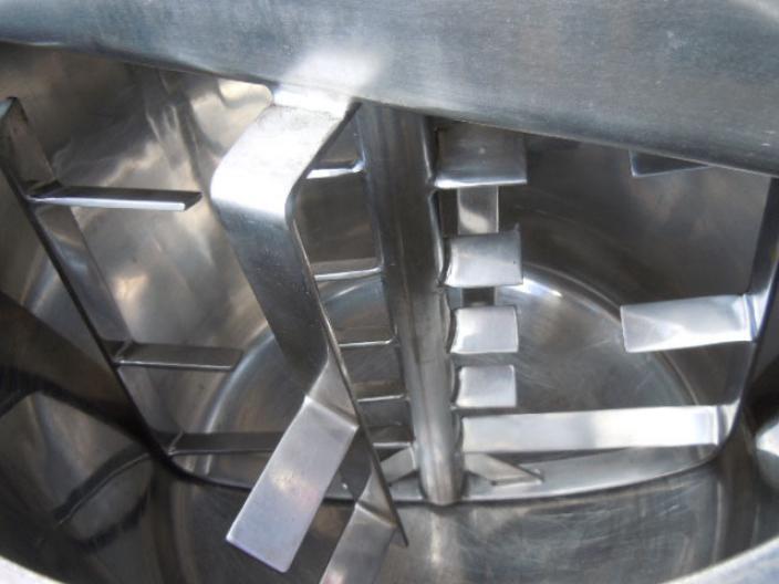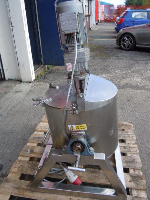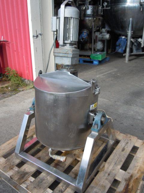 Stainless steel mixing vessel on a stainless steel support frame. 450mm dia x 450mm deep, gross capacity 71 litres, approx working capacity 50-60 litres. Flat top cover with clamps. Half hinged access section. Gate type agitator driven by a 0.5kw motor. Four baffle plates on vessel wall. The vessel has no bottom outlet, product is discharged by tilting the vessel on its frame with safety latching. There is a stainless steel jacket to the vessel complete with a pump and hose.