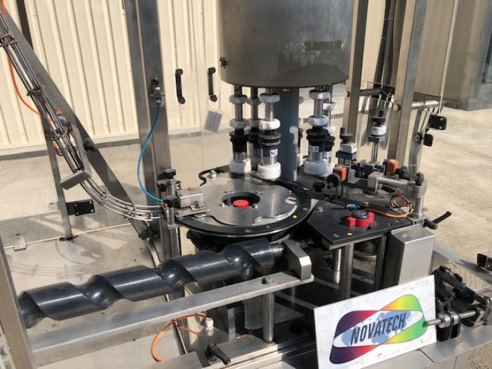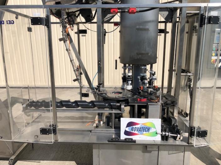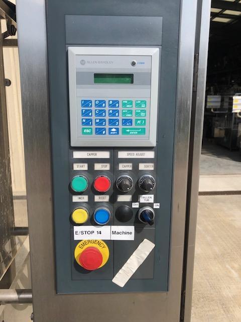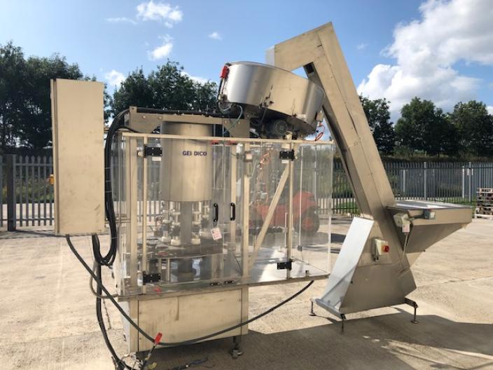 DICO ENGINEERS, fully automatic six head screw capper in stainless steel with full PERSPEX safety interlocked guarding, supplied new in 2003 and only had occasional use. Stainless steel 950mm dia x 310mm deep cap sorter/unscrambler with spiral cap feed track, delivers 50mm dia x 16mm deep plastic screw caps onto the six position starwheel. The starwheel indexes the cap to the cap chuck pickup location. The machine has a scroll infeed spacing device for the product pots which then transfer onto the pot starwheel. The capped pots transfer onto the outfeed starwheel. Stainless steel control panel with capper start/stop; inch; reset; capper speed; sorter speed; fallen tub sensor; The machine is complete with its matching cap elevator in stainless steel, with cap hopper 800mm x 880mm x 500mm deep. Polypropylene track which has 200mm wide x 80mm deep flights at 150mm spacing. Cap discharge height approx 2.6 metres, height adjustable feet, EStop and mains isolator. Overall dimensions 2280mm x 1370mm x 2.7metres high. Excellent condition.