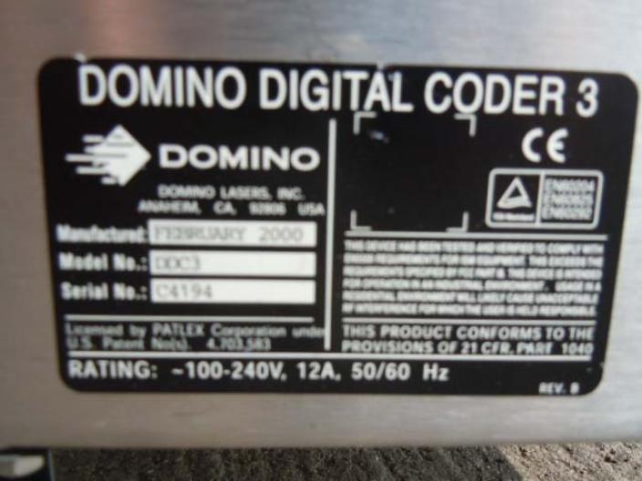 DOMINO type "DDC3" high speed laser coding system, upto 2000 characters/sec (speed) (3000 max) per line per head at six strokes/character. 5 x 5, 7 x 5, 7 x 7 & 7 x 9 (HxL) dots/character. Character height variable from 1 to 5mm (50mm lens set) or 1.75 to 11mm (70mm dia lens set). Maximum message length 253 plain characters.