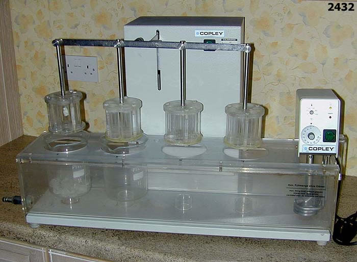 ERWEKA model ZT44 tablet disintegration tester supplied new in year 2000. Four station water bath with 110mm dia (2 missing) glass flasks, each with 6 x tablet tube holders. Thermostatically controlled water bath with speed controllable circulation, max 100C. Operating and temperature alarm LED's. Drain valve outlet. 240v 1ph electrical supply Overall dimensions 745 x 390 x 480mm high.