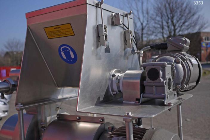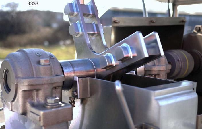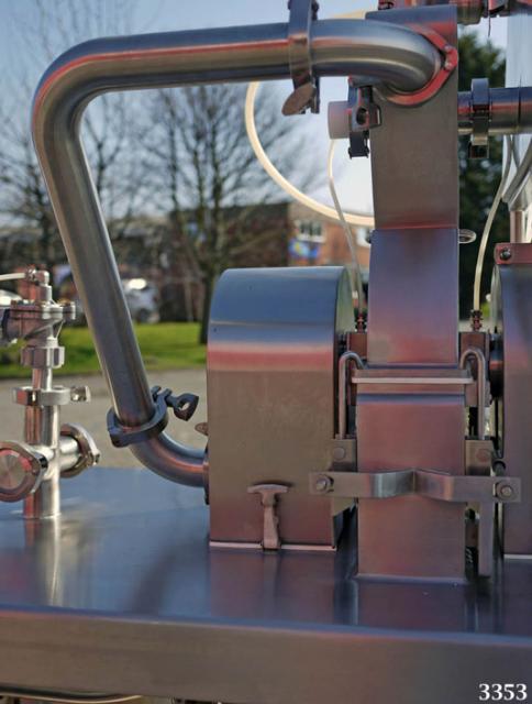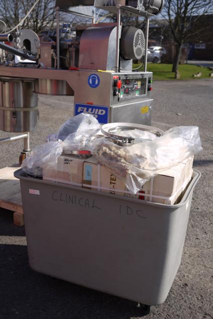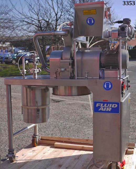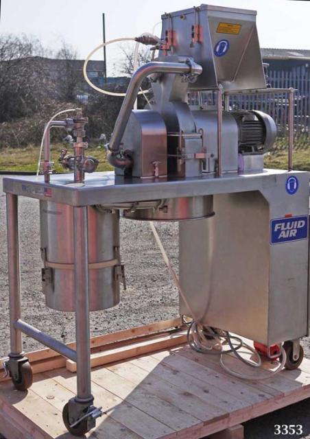 FLUID AIR type 003 high energy turbo type micronising mill constructed in 304 grade stainless steel (rotor in 17-4PH stainless steel) with No 4 grit polish finish, supplied new in for product development applications so the machine has had very limited use and is in excellent, clean condition. Product feed hopper (approx 20 litres) with variable speed drive and RPM indication. The machine is intrinsically safe as it has a full nitrogen purge system to all of the hazard zones (the mill feed hopper; mill feed device; and rotor bearing seals). As a safety feature their is an oxygen (PAC II) sensor which monitors the O2 levels and shuts down the power if the O2 level of 6% is exceeded. The Mill rotor has a four arm design with two fixed impact blades on each arm. Each impact blade has a flat surface and a radiused surface to enable two milling options by reversing the rotor direction of rotation. The mill chamber cannot be accessed without removing the bolted mechanical guarding system. The machine has an Estop and DC brake for instant stop. The machine control panel is purged with compressed air and has a 10 minute delay before power can be operated. On the machine is a large capacity high efficiency exhaust filter with reverse jet cleaning system and removable collection bin. The original user manual with drawings etc is available.