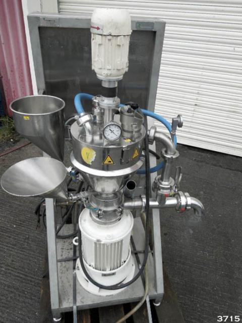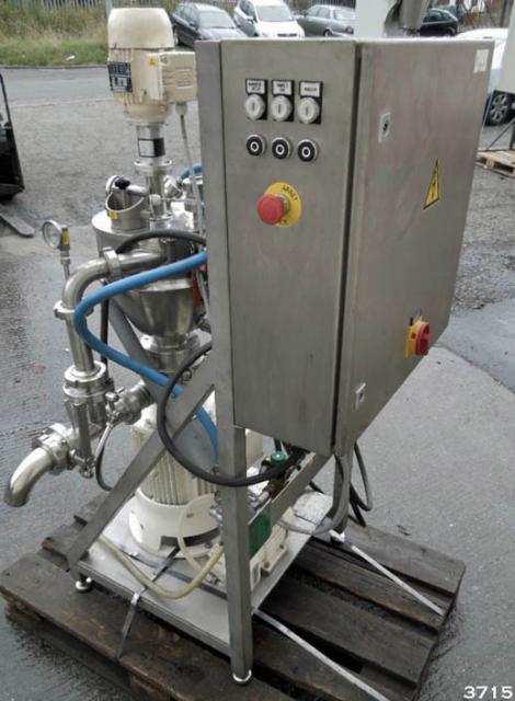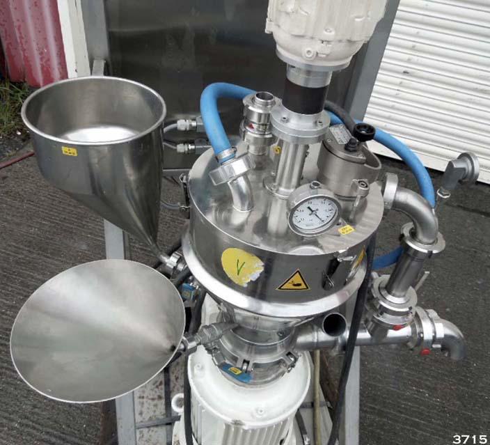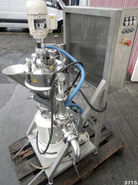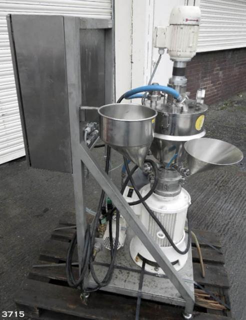 FRYMA-KORUMA model MZM/VK7 laboratory/product development scale vacuum mixer/homogeniser. The Fryma Koruma MZM/VK7 is designed for liquid/solid phase mixing/blending of creams, ointment, gels etc. Integrated unit constructed in 316 grade stainless steel, supplied new in 2004. The MZM/VK7 is mounted onto a stainless steel support frame with stainless steel control panel. 11 litre conical upper chamber with jacket section. Detachable clamped top cover with top mounted mixer, vessel light/viewing window with wiper, vacuum connection to vacuum pump, indicator gauge. The MZM/VK7 has a high speed 100mm dia homogenising workheadhead, under driven from an 11.58kw 400v 50hz motor. Two additive ports with direct feed to homogeniser. Product discharge system can be set to discharge via a valve controlled recirculation system for multiple pass cycling of product. Vessel rated at -1 bar & 100 C, jacket rated at 2.5 bar. The MZM/VK7 is CE marked.