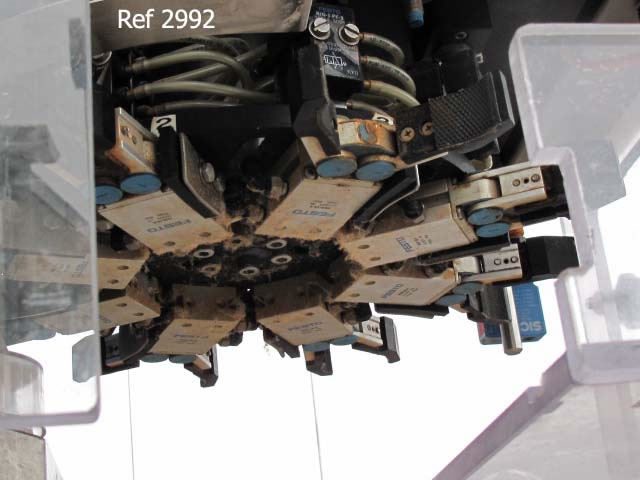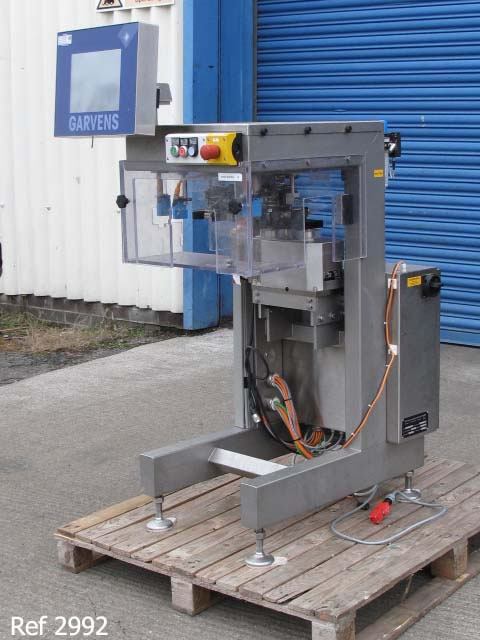 GARVENS model S2-S inline checkweigher supplied new in 2004 and is in exceptional condition having had very little use. Has 0-100gm weighing range, rotational weighing head has 8 sets of pick up jaws which pick up product from infeed position, the product is then checkweighed whilst being suspended and is deposited at the outfeed station by the rotating head. The adjustable jaws will open out up to 70mm wide. 240v 1ph supply. Touch screen control panel. Overall dimensions 750mm x 970mm x 1400mm high