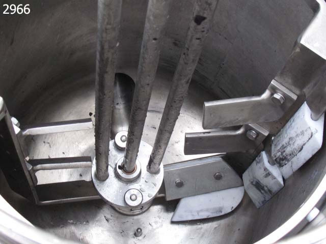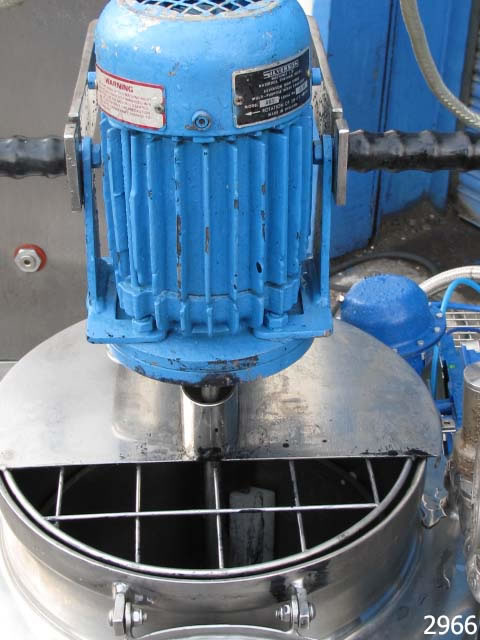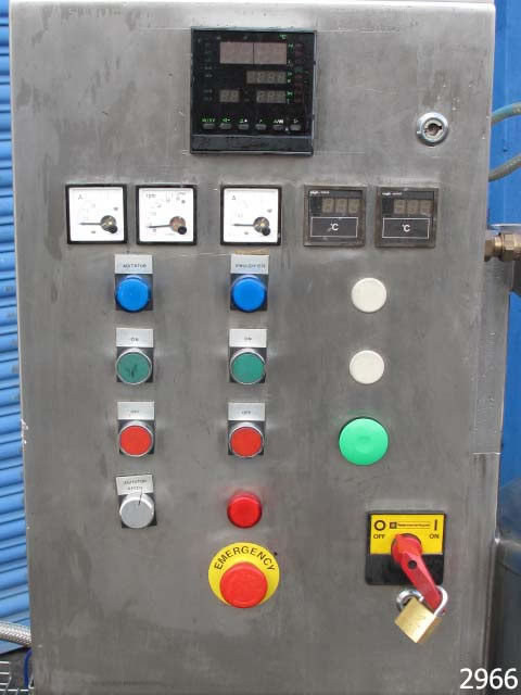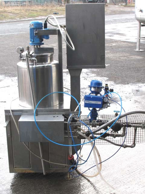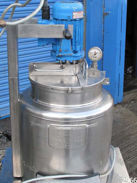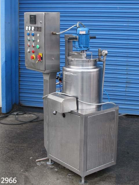 GIUSTI mixing vessel 300mm dia x 470mm deep with shallow dish base, gross capacity 33 litres approx working capacity range 5-25 litres, top entry Silverson model AX3 homogeniser with 60mm dia workhead, 0.26kw 2730rpm 415v 3ph supply flameproof motor. Scraped surface main mixer, 30mm dia bottom product outlet. Stainless steel heating jacket, insulated and clad in rigid stainless steel, rated at 3bar w.p. 6bar t.p; Stainless steel control panel with 2 x amp meters, motor stop/start, LCD display for temp, variable speed control with RPM display for main motor. Overall dimensions 1350mm x 800 x 1660mm high. Supplied new in 1990, previously used on cosmetic product manufacture, excellent condition.