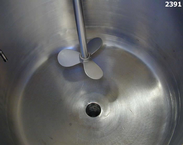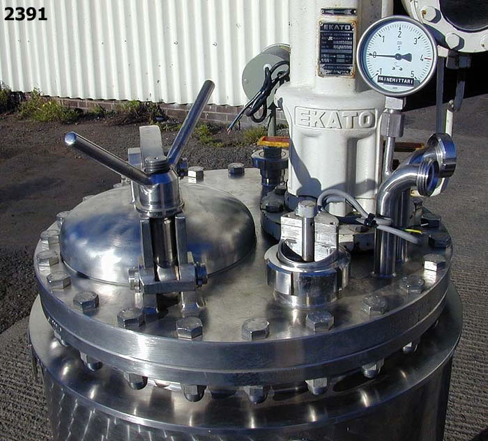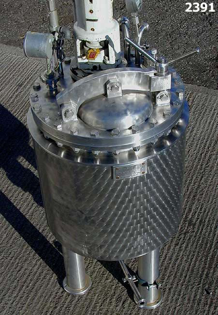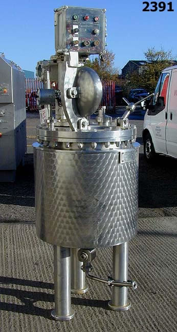 HAAGEN & RINAU very high quality process vessel in 316 grade stainless steel. 550mm dia x 600mm deep, gross capacity approx. 143 litres, working capacity 122 litres. Nameplate stamped vessel: 151C, -1bar(full vac) to 4 bar, jacket: 164C, 6 bar. Fully insulated with rigid stainless cladding, lapped finish. 170mm dia 3 blade propellor on a 25mm dia shaft driven at 460 or 960 rpm from a 0.65 kw 3ph motor. Mechanical shaft seal with flush system. Flange mounted bolted top cover with a 260mm dia chargeport with clamped cover, vessel light with wiper blade, vacuum/5bar pressure gauge, temp probe with 0-160C gauge, 3 x 25mm dia connections. Electrical panel with stop/start, speed selectors, light on/off etc. Bottom product outlet 50mm dia with valve and outlet to side branch. The vessel is mounted onto 3 x 100mm dia stainless legs. Overall dimensions 680mm dia x 2030mm high.