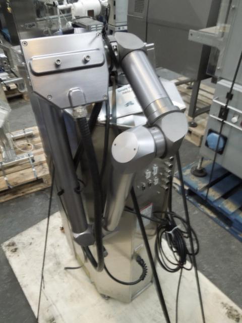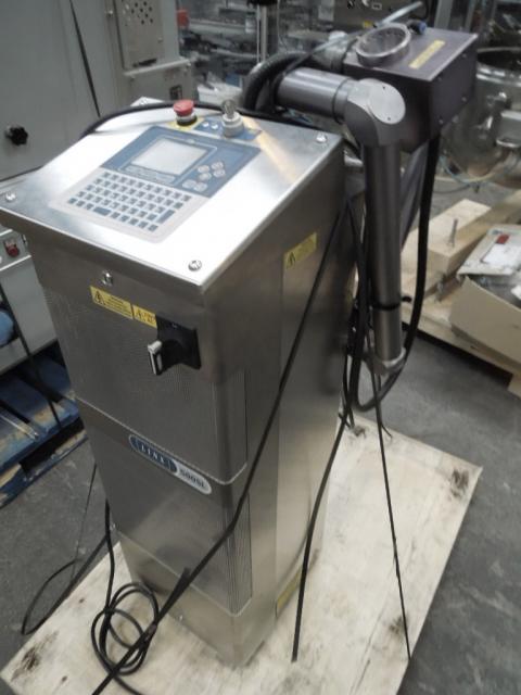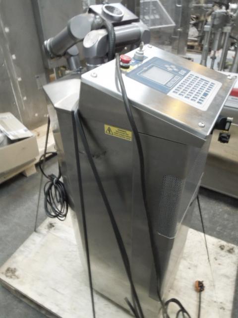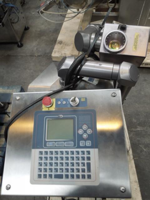 LINX 500SL high speed laser coding system, supplied new in 2007, stainless steel enclosure with anodised aluminium articulated position adjustable arm with max 1.1m horizontal reach. The coder can generate up to 100 lines of code (max) but typically 25 lines (max). Standard one line code speed is 500 metres/min. For large character single line code the maximum speed is 740 metres/min. "Mark Field" is 75mm x 75mm (standard character) and 120 x 120mm (large character). Marking distance 120 +/- 2mm (standard) and 200 +/- 2mm (large). Character height 1 to 75mm standard and 1.5 to 120mm large. Features include: 0-360° orientation; column by column printing; barrelling correction; circular text; linme spacing; bi-directional printing; graphics download.