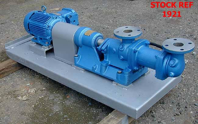 MONO positive displacement pump type SH60 D5/F in stainless steel. 50mm dia flanged inlet/outlet connections. Long coupled to a 3kw 415v 3ph 1420 rpm flameproof motor and mounted onto a painted steel baseplate. Ex food industry.
