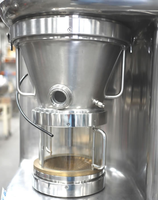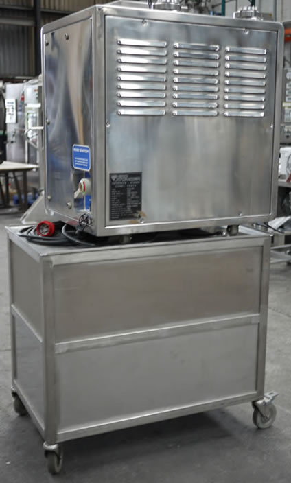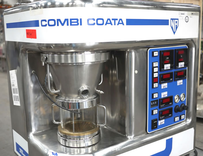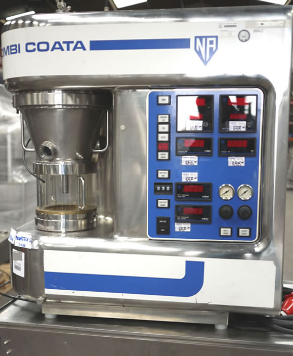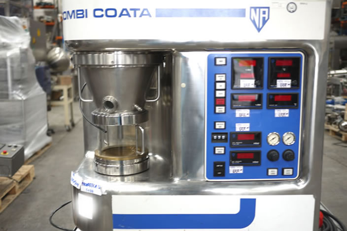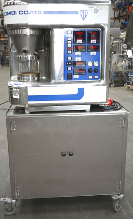 NIRO ATOMISER type CC1 "COMBICOTA" lab scale fluid bed dryer/coater/granulator designed for: (a) film coating of pellets; (b) coating of particles larger than 200 microns (pellets, granules, crystals); (c) drying of granules, powder etc. The smaller product container (60mm dia base) can contain approx 100-1000gm pellets (subject to product density) whilst the container when used for powder or granules the product weight can increase to 50-300gms and 100-500gms. A cleanable filter sock assembly is available for when coating/agglomerating powder or granules. Electric heater rating 4.5kw, fan motor 1.1kw 3 x 240/415v 50hz. The product contact surfaces are 316 grade stainless steel. The unit is mounted onto a stainless steel base with storage cabinet and 4 x castors for mobility. Supplied new in 1991.