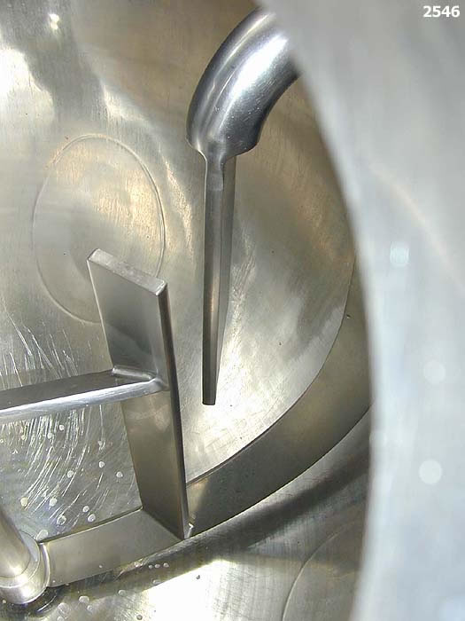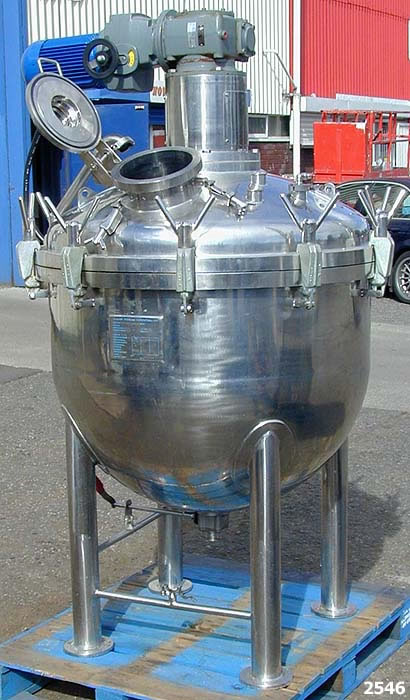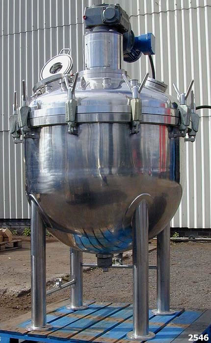 ~SINCLAIR STAINLESS hemispherical mixing vessel in polished finish 316 stainless steel, supplied new in 1992. 1.0m dia x 1040mm total depth (from flange face), gross capacity approx 700 litres. Design pressure 4 bar and full vacuum, test pressure 5 bar. Anchor profile type mixer with baffle plates driven from a 1.5kw 1440 rpm EExd flameproof motor via a hand adjustable variable speed gearbox. 2 x static baffle plates fitted. Flanged top dish with quick release clamp set and has one 200mm dia chargeport with sightglass, 1 x 80mm lightglass, 5 x 35mm dia connections. Bottom outlet 40mm dia with valve fitted, 220mm ground clearance. The vessel stands on 4 x 80mm dia stainless legs, overall dimensions 1200mm dia x 2030mm high.