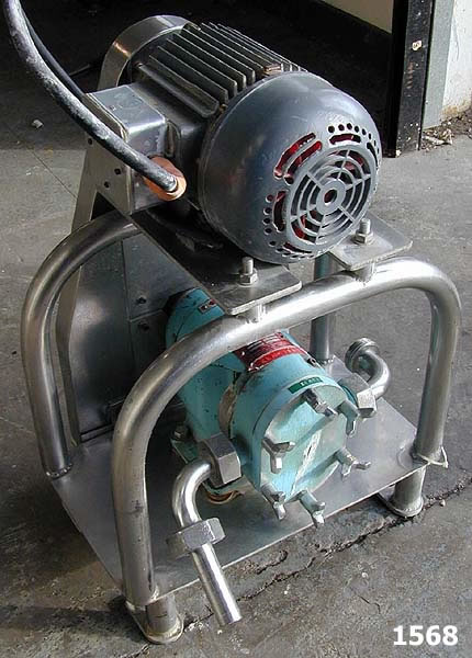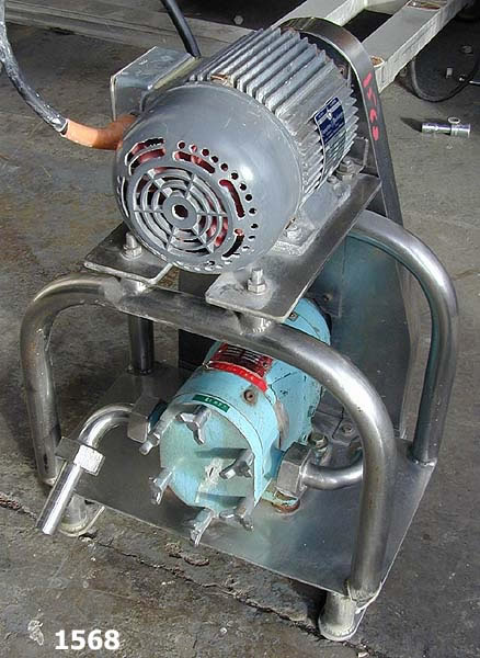 SSP model 75ND positive displacement rotary lobe pump with 316 grade stainless steel contact parts. 20mm dia inlet/outlet connections with RJT fittings. Driven from a 0.55kw 415v motor via a belt and pulley system. All mounted onto a stainless steel support frame. Ex Pharmaceutical use.