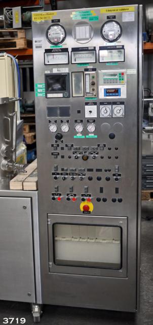 GLATT GCPG 3 fluid bed dryer- granulator processor constructed in 316 grade stainless steel supplied new in 1995 (fully serviced by Glatt in 2013). The machine is suitable for lab or product development scale applications and is supplied with a number of bowl attachments for various batch volumes (including 3 and 5 litre), External heating supply unit. Air filtration system located in the machine base. A large number of boxes of associated spares are included with the machine which is in excellent hardly used condition