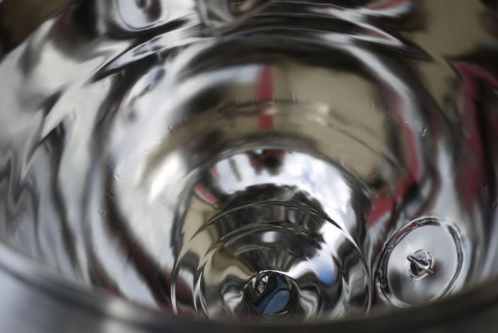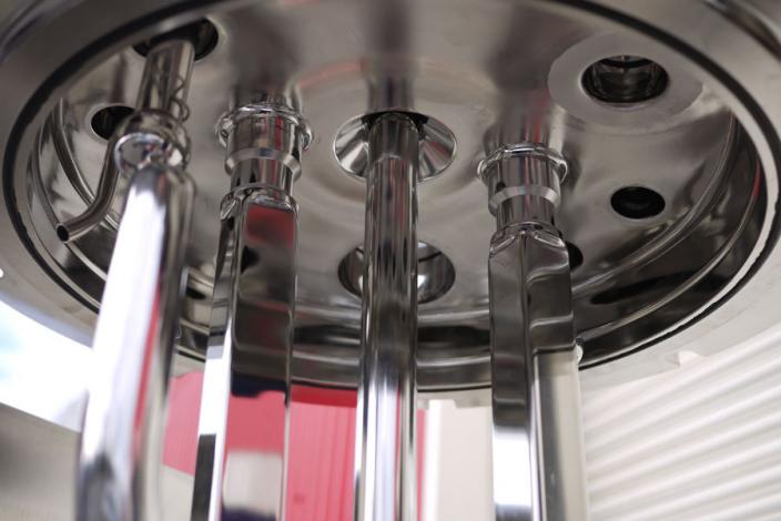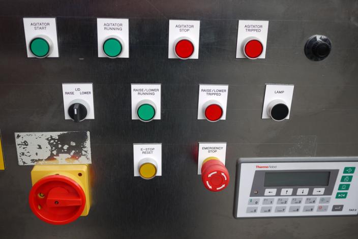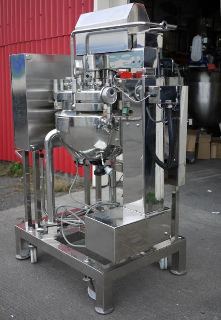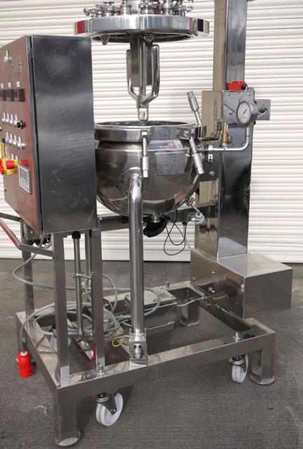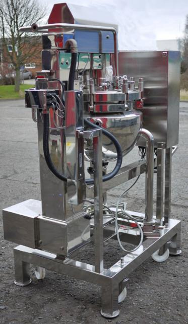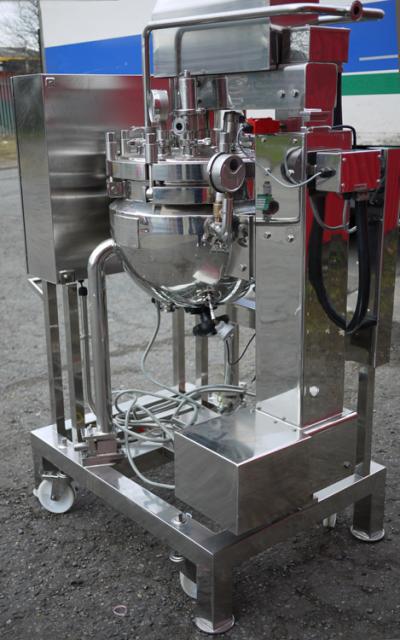 BPT SKERMAN UNUSED mobile process vessel constructed in 316 grade stainless steel with mirror polished finish to vessel interior and exterior surfaces. The hemispherical vessel has been made to a very high standard of quality and specification. 430mm I.D. x 360mm deep. Grosss volume to flange face is 42 litres suggesting that the nominal working capacity is approx 25-30 litres. The product outlet is 50mm dia and has a manual valve closure. The vessel is rated at 6 bar and full vacuum design pressure and -30 to 120°C. The stainless steel jacket is rated at the same as the vessel, the test pressure in both cases is 11 bar. Anchor type agitator with variable speed control, 2 x static baffle plates project from the top dish. Main vessel features are :- temperature probes to vessel jacket; hydraulic system for top dish raise and lower; load cell system fitted to vessel legs; vessel light and numerous connections on the top dish, analogue pressure and temperature gauges fitted, pressure relief valve with pre-set adjustment, safety interlock system; CIP spray-balls fitted. Stainless steel control panel and vessel are mounted onto a mobile 50mm square section frame. Overall dimensions 410mm x 840mm x 1100mm high.