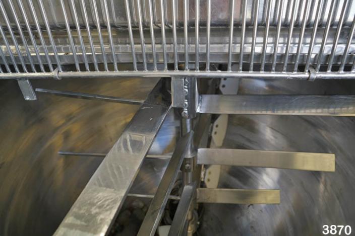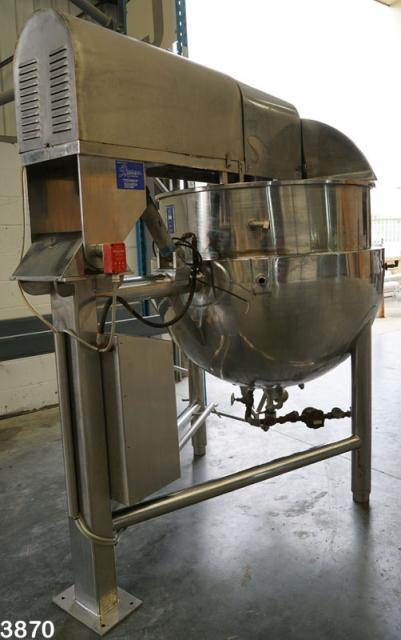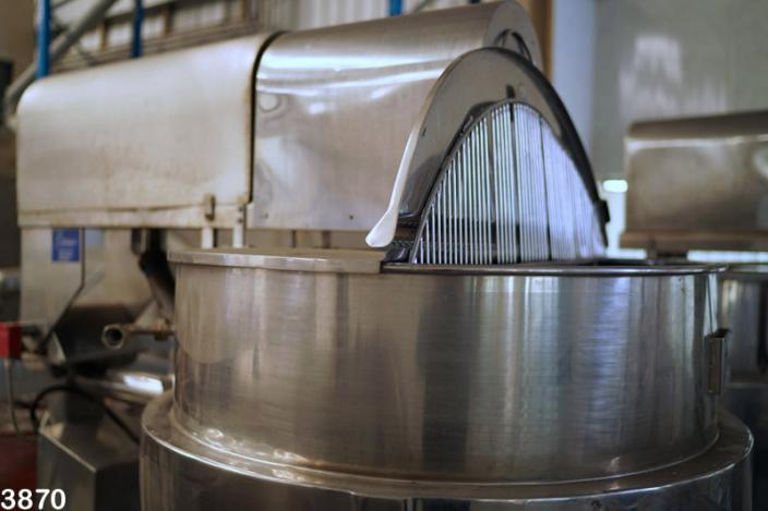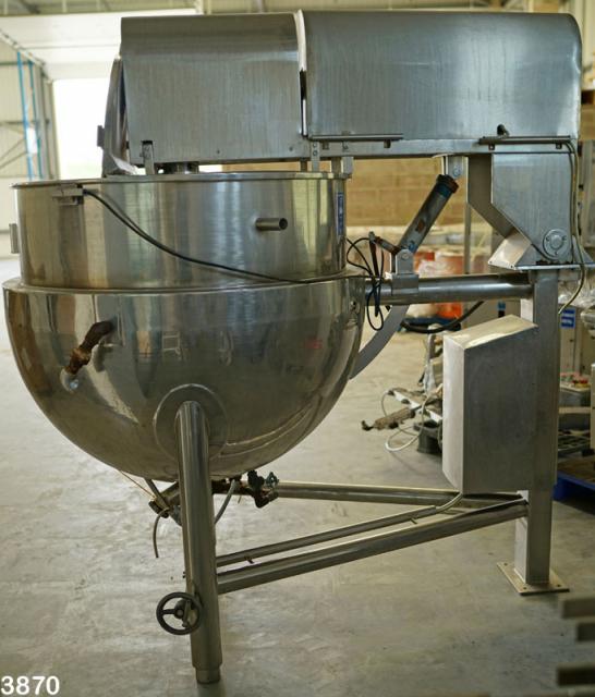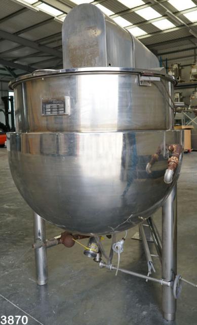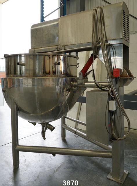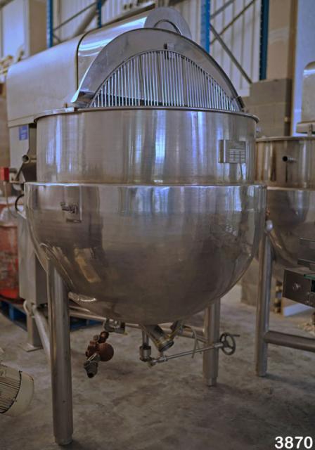 Skerman hemispherical process/mixing vessel constructed (1996) in food grade stainless steel to BS 5500 Cat. 3 design code. Approx 1.2m diameter x 1.0m total depth. Approx 1,206 litre gross volume. 80mm dia centre bottom product outlet (RJT) with remote manual valve operation. Stainless jacket to hemisphere area rated at 3.1bar design pressure. The jacket is insulated and rigid stainless steel clad with polished finish. Full profile scraped surface agitator with contra rotating baffle plates. The vessel top cover and mixer gear is power raised and lowered hydraulically. The vessel stands on three 80mm dia legs, 1640mm height to vessel rim. Top cover plate has a 360mm wide hinged raised access panel with a safety grid. Jacket and vessel design temperature is 143 C. Approx overall dimensions 1900 x1300 x 2250mm high. (two matching vessels available) Previous product usage, dessert manufacture.