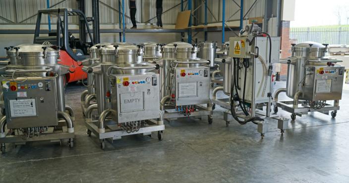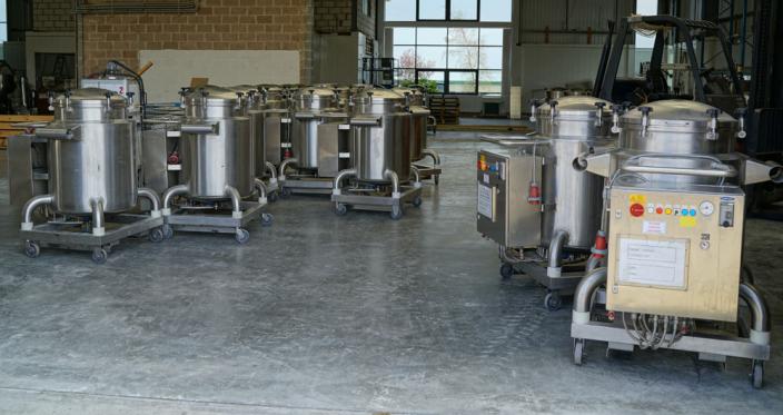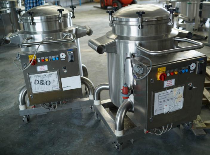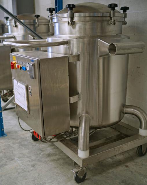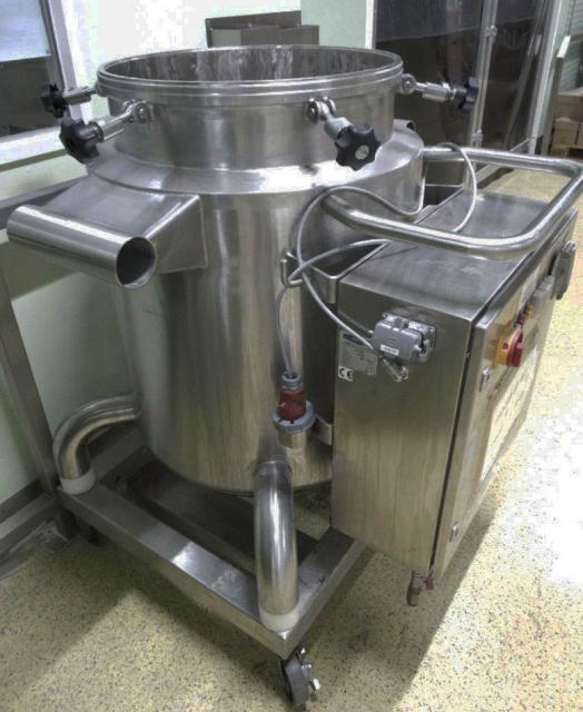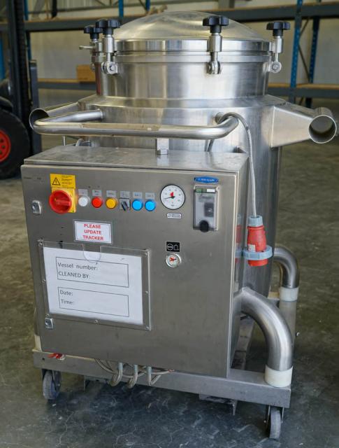 KUGLER mobile pressure rated mobile vessel constructed in 316 grade stainless steel. 600mm dia x 900mm deep, 225 litres approx gross capacity. One of a total of 25 matching vessels. Usage process: as a holding vessel for cosmetic product (mascara) to maintain a constant temperature whilst being pressure discharged to a filling machine. When discharging was complete, the empty vessel was transported to a purpose made high pressure hot water intensive cleaning CIP module. Cleaned vessels were transported to the product refilling supply vessel. Vessel features: Polished finish pharmaceutical/cosmetic quality standard construction. Bottom dish with 50mm product outlet with butterfly valve closure. Top dish with sealed cover plate, secured by 6 quick release swing bolt clamps. Vessel base and sides fully insulated and rigid stainless clad. Integrated control panel with three thermostatically controlled heating zones. 4.5kw, 100C max, 415v. Each vessel is mounted onto a stainless mobile frame with castors and grab handle. The vessel system was originally part of a KUGLER supplied turnkey project for a major International cosmetics manufacturer in recent years. The vessels can be purchased singly or in quantity either with or without the high spec CIP module listed as a separate stock item (Ref 3937). Approx overall dimensions each vessel: 1100 x1020 x 1400mm high.