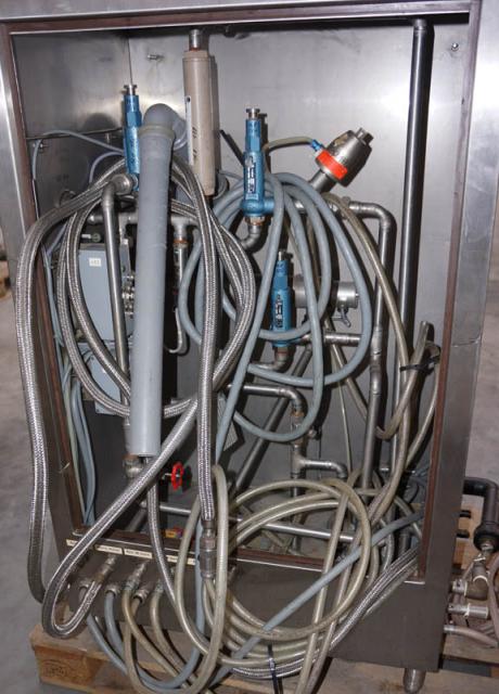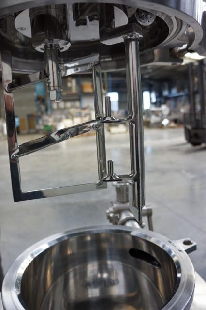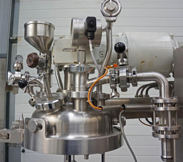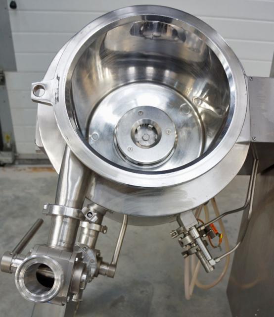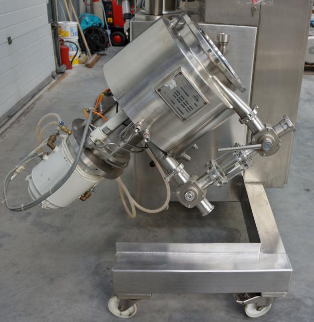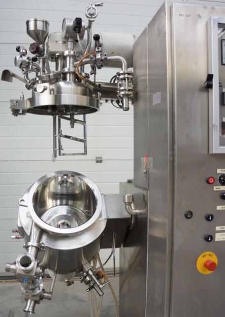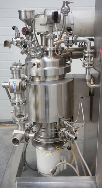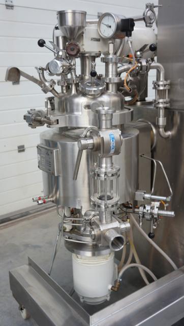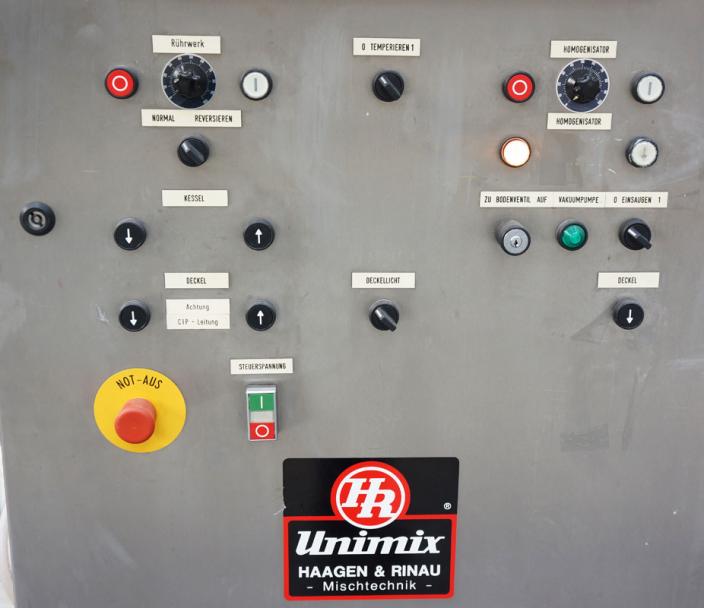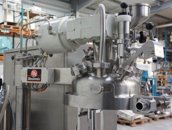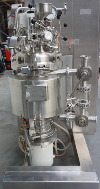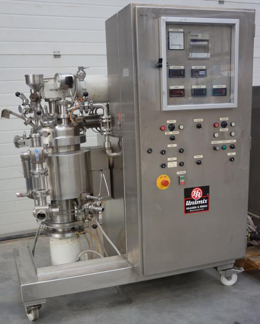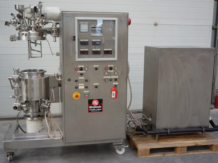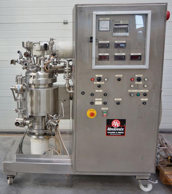 Haagen & Rinau UNIMIX SRT15 high quality process vessel in 316 grade stainless steel. The vessel gross volume is 22½ litres, rated @ full vacuum and 2 bar W.P. and 133°C. The vessel jacket is rated at 4 bar W.P. and 151°C. Bottom entry underdriven homogeniser with variable speed control setting on the main panel. The vessel has a hydraulic tilt feature allowing access for cleaning etc. Vessel top cover has hydraulic raise/lower of the scraped surface mixer unit. Top cover features include 0-4bar gauge, pressure relief valve, viewing port and additive port with hopper.