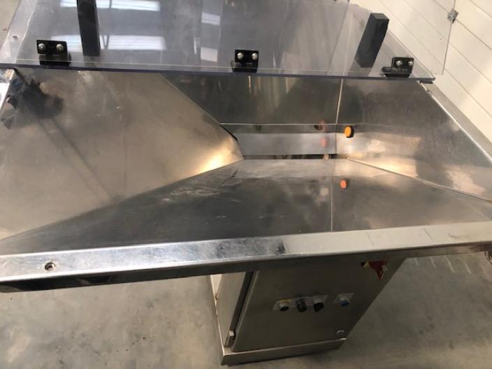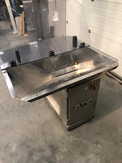 DT Industries "Swiftlift" automatic operation tablet/capsule elevator in stainless steel, bulk product hopper 900mm x 900mm x 400mm deep. Stainless steel product scoop 300mm x 200mm x 200mm is auto filled with product from the base of the hopper and elevates vertically and auto discharges into the feed hopper on production machine, vertical traverse distance to a 1.6m discharge height. The elevator section has PERSPEX safety interlocked guarding. 240v 1ph operation. Machine has castors for mobility.