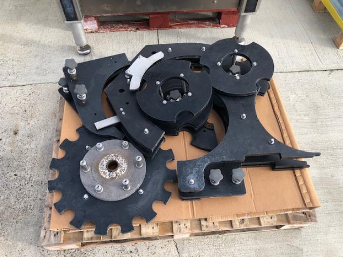 Zalkin model CA3 360NG fully automatic three head screw capping machine constructed in stainless steel, presently fitted with 1 head capping chuck only, supplied new in 2005. The overmounted cap unscrambler is approx 550mm dia x 600mm deep; with a cap guide track to orientate the caps and deliver them to the capping heads. The existing starwheel transport has 16 pockets to suit 60mm dia containers. The machine has a 100mm wide x 3.8m long slatband conveyor and an electrical safety interlocked access panel. Full feature stainless steel machine control panel. Machine dimensions 3.8m long x 1.5m deep x 2.4m high. The machine is only fitted with one cap chuck at present, approx output speed on single head 50-60bpm, extra heads can be fitted for higher speed if required.