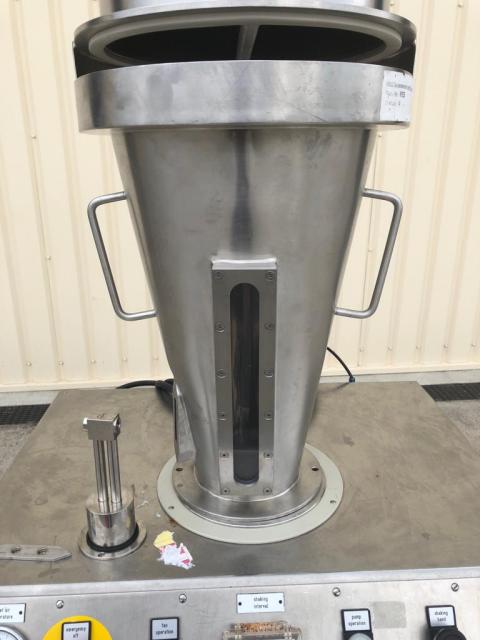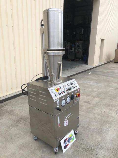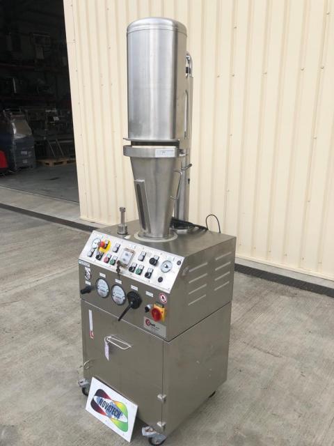 GLATT "UNIGLATT" small scale (lab/product development) fluid bed dryer in 316 grade stainless steel. CE marked. 0.88bar (13psi) operating pressure, fan 2.2kw, air heating 1.7kw. The machine is complete with a standard 300mm dia x 470mm deep product bowl for fluidised bed drying with a mirror polished internal finish. It has 3 30mm wide x 260mm long viewing panels. The working capacity of the machine is approx is approx 5 litres. The stainless steel base of the unit has two opening sections and it is mobile on castors. All the machine controls are easily accessible on the front fascia. Overall dimensions are 700mm x 600mm x 2.2m high. Excellent condition.