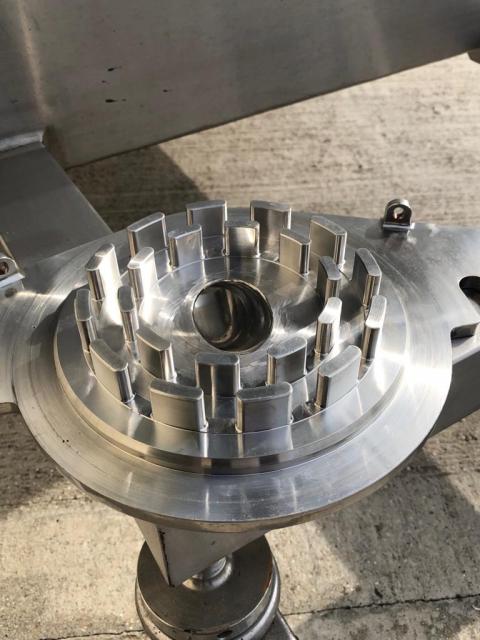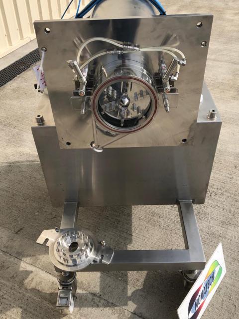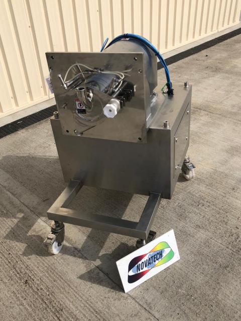 NARA model "SUPERCLEAN MILL SCMO" pharmaceutical/food quality pulverising impact mill with mirror polished 316 grade stainless steel product contact surfaces. The mill is driven from a 1.5kw 11,950rpm motor resulting in the dynamic conditions required for sub micronic particle output. The machine is easily disassembled for cleaning. It is mounted onto a mobile stainless steel frame.