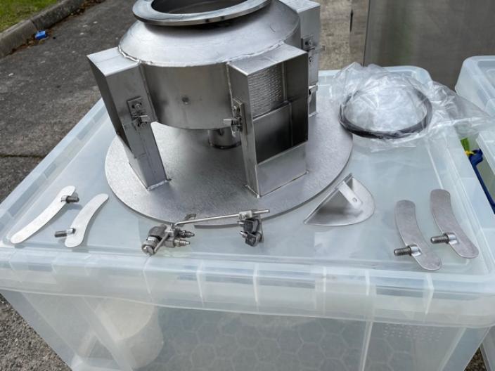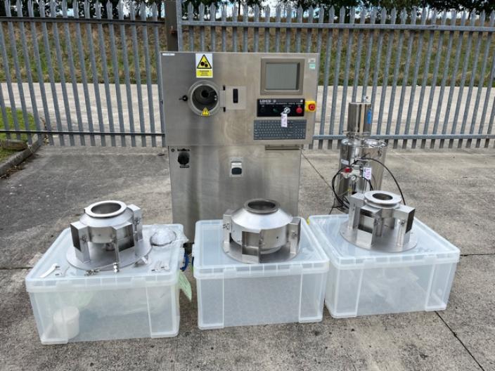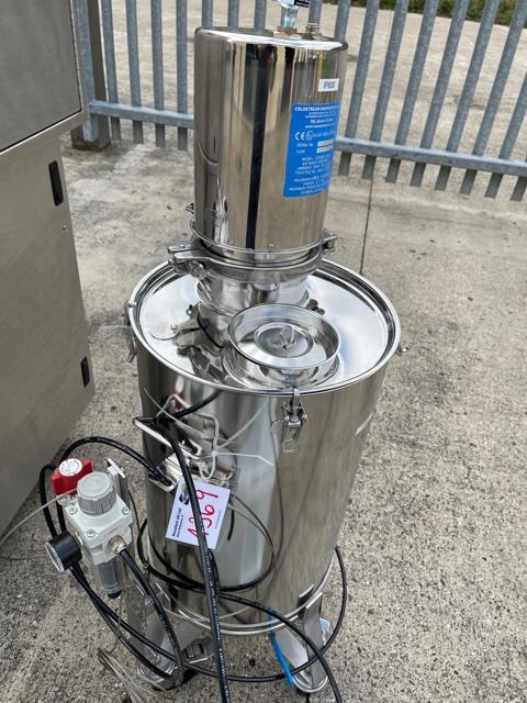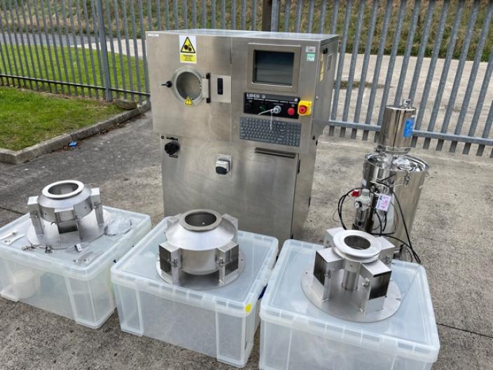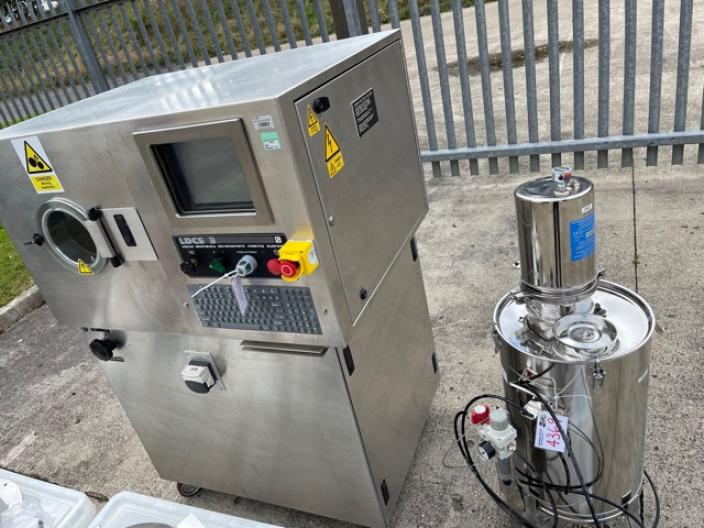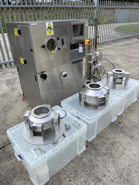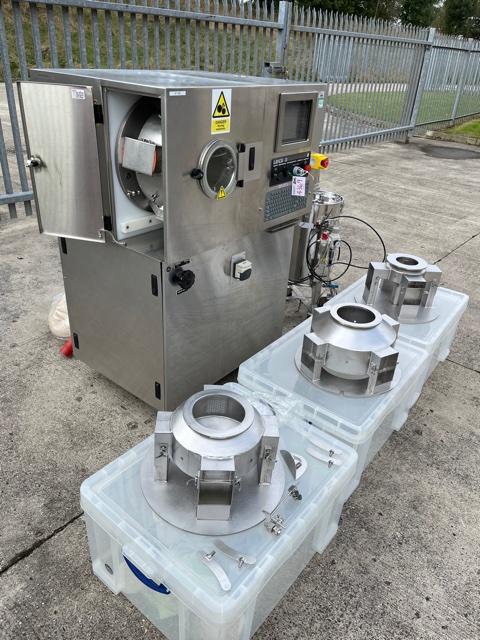Vector Freund LDCS-3 film coating machine, stainless steel construction with a selection of interchageable bowls. Also supplied with mirror polished Coldstream Engineering supply vessel.