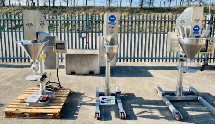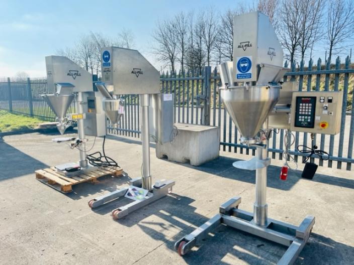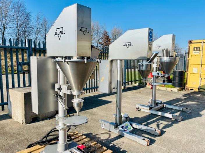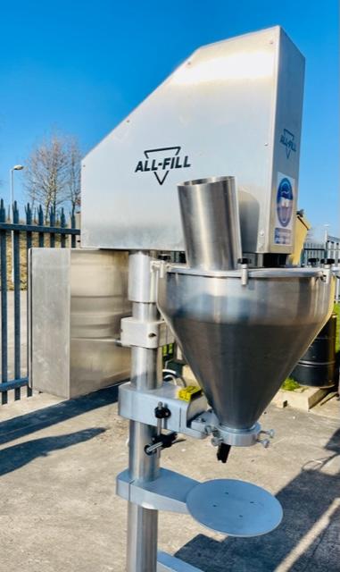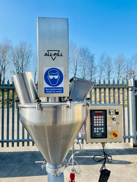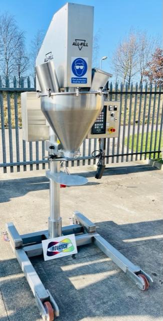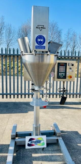 ALLFILL INTERNATIONAL model S10 semi automatic powder filler in stainless steel Conical product hopper 530mm dia x approx 500mm deep, gross volume approx 25-35 litres. The hopper has a rotating scraper arm which assists the product flow by preventing product bridging in the narrow zone of the hopper. There is a 40mm dia auger/funnel set with mirror polished finish. A freeflow set is fitted to the auger to stop product leakage between fills. The hopper has a safety interlocked top cover with a 200mm x 100mm hatch and cover and a 120mm dia powder loading port and a level sensor which controls the loading cycle pneumatic transfer system. The machine QUANTUM II control panel features stop/start; emergency stop; mode selector; fill enable; status; auger setting; cut off; agitation; empty hopper. The machine is mounted onto a column with a 700mm x 500mm base and there is a position adjustable 310mm dia platform for the container being filled. Overall height 2.2m
