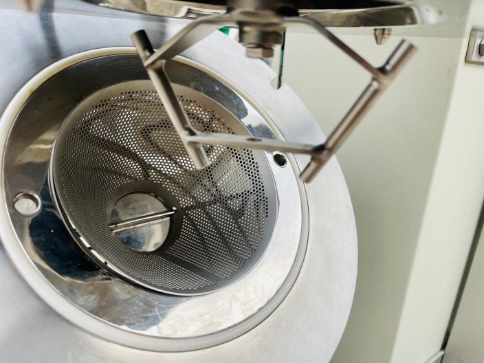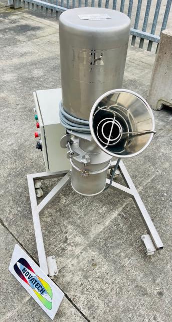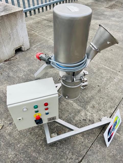 KEK Kemutec 120 pharmaceutical quality cone mill in 316 grade stainless steel, model 120. Detachable 200mm dia product loading port with electrical safety interlock device fitted. Mill chamber with rotor and 120mm dia perforated stainless steel conical screen 170mm dia product discharge 810mm clearance to floor. 240v 1ph electrical supply. Control panel with m/c stop/start;estop; variable speed setting with LCD indication; Ammeter with LCD display; trip/reset. Mounted onto a stainless steel support frame with castors. Overall dimensions 700mm wide x 930mm deep x 1650mm high.