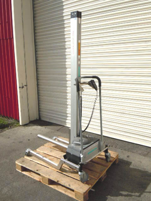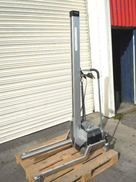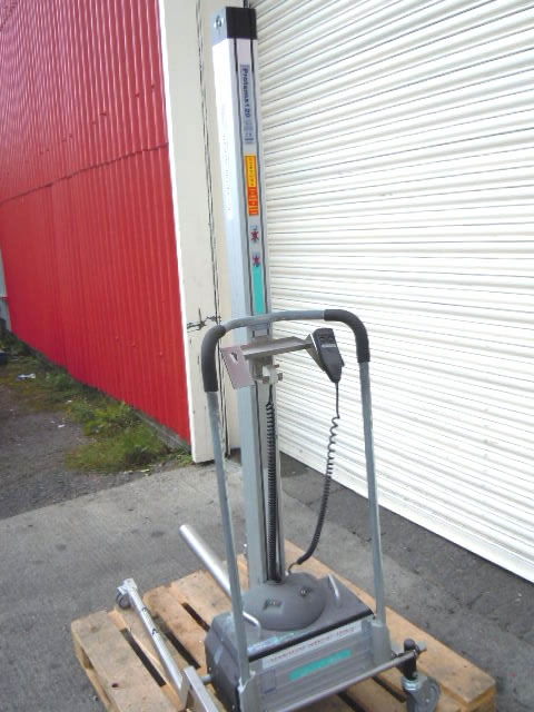 TAWI "Protema 120" battery powered mobile electric hoist with 60mm dia x 700mm long bar typically used for use raising packaging reels etc into position from floor. Max lift height 1.8mtrs. Max weight 120Kg. Operator remote control input.