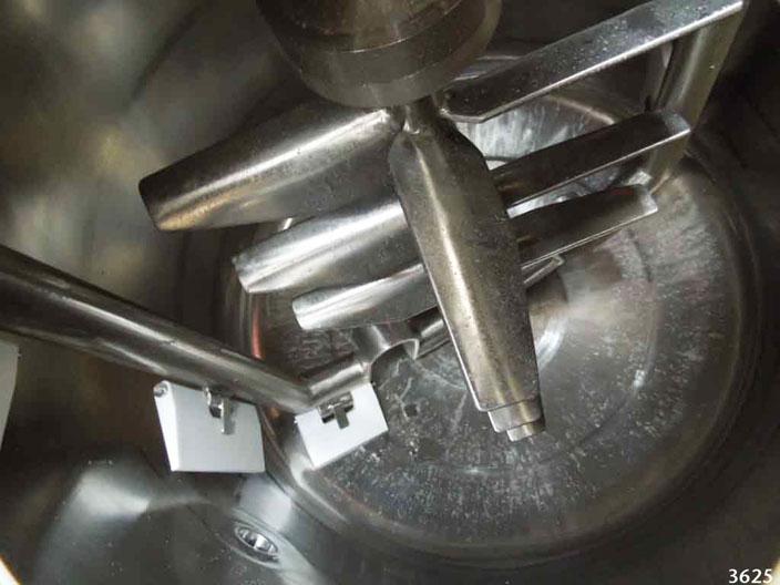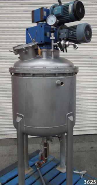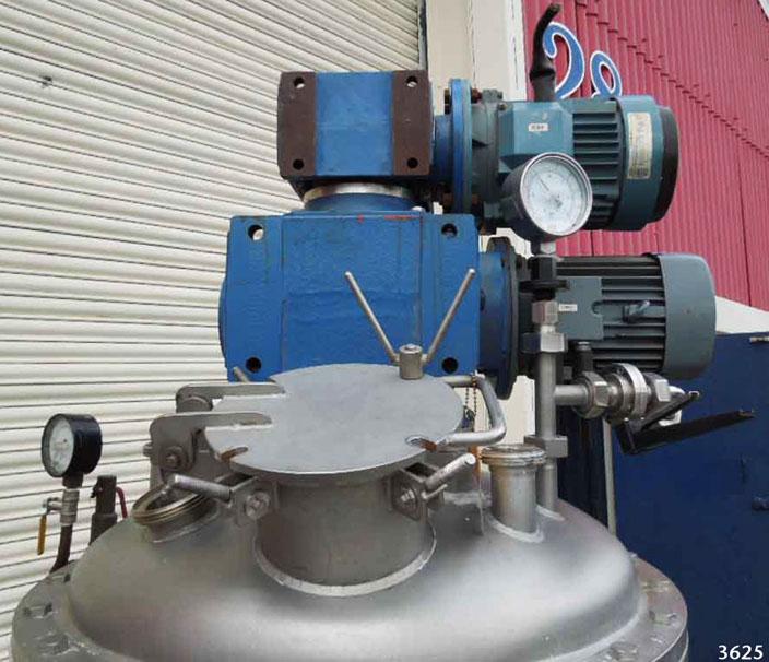 Websters process vessel in 316 grade stainless steel,approx 650mm inner dia x approx 625mm effective depth. Approx 207 litres gross capacity. Bolted on dished top, welded 185mm deep bottom dish with 32mm dia product outlet. Vessel rated at 1 bar and full vacuum@ 144 c. S/S jacket rated at 3 bar & full vacuum. Main drive for full profile scraped surface mixer, second drive for contra rotating baffle mixer. Both mixers driven from 2.2kw 1430 rpm variable speed range 28-250 rpm. Vessel top dish has 2 x 50mm dia connections,150mm dia chargeport, 1 x sightless, 1 x pressure releif valve + gauge. Vessel stands on 3 x 80mm dia S/S legs. Overall height 2.2m. Supplied new in 1994.